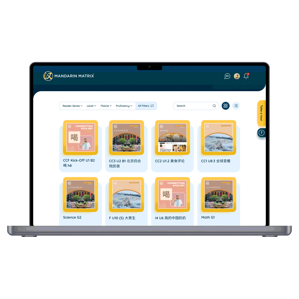 Mandarin Matrix 不仅是我们第一个完全采用的资源,而且已成为我们普通话双语课程不可或缺的组成部分。它与我们的主题课程无缝整合,使我们能够提高 K-5 年级学生的普通话水平目标。