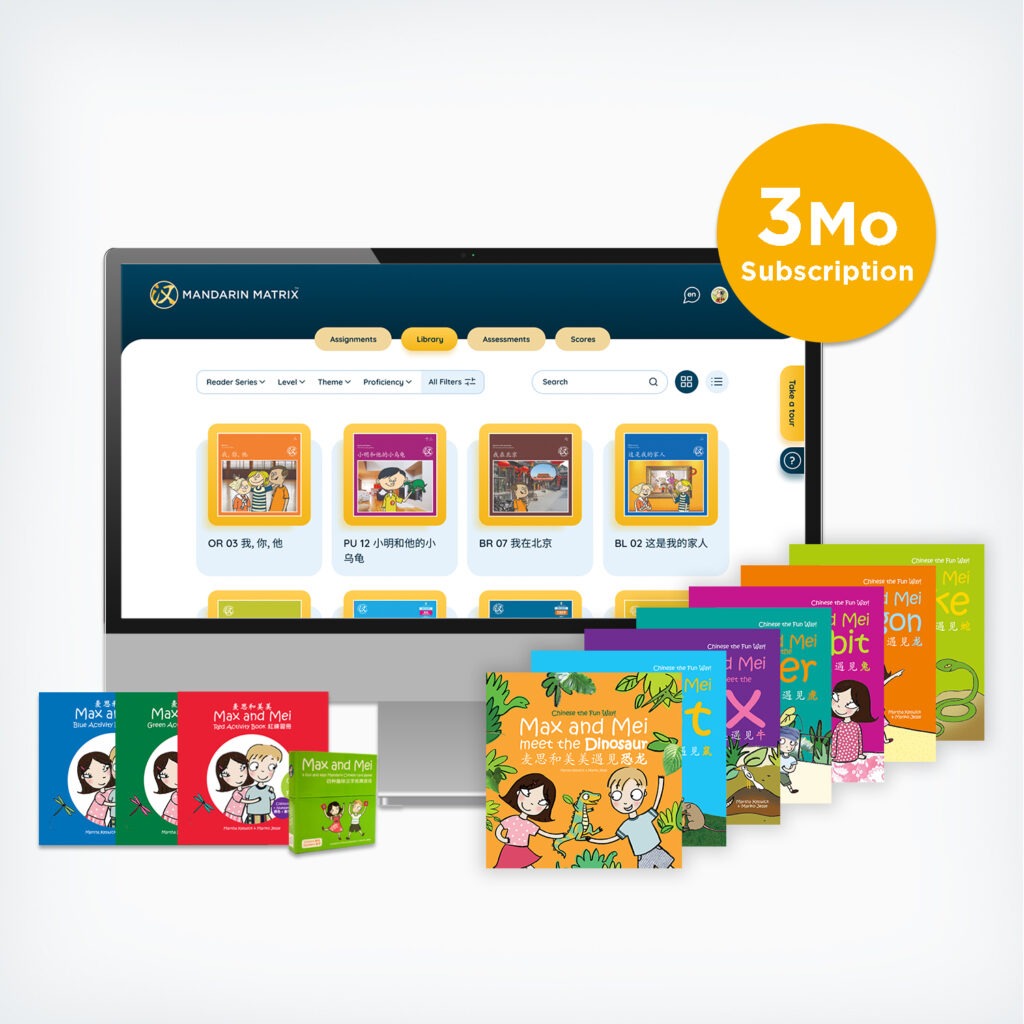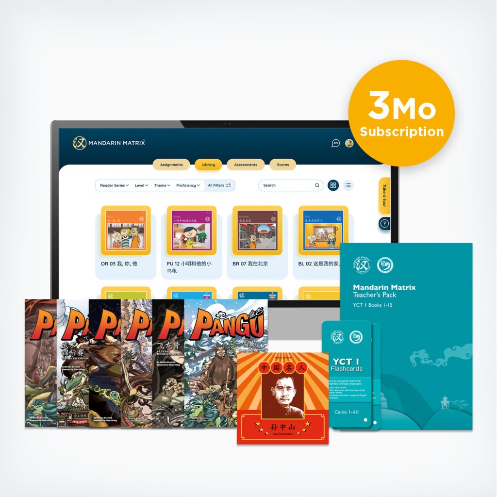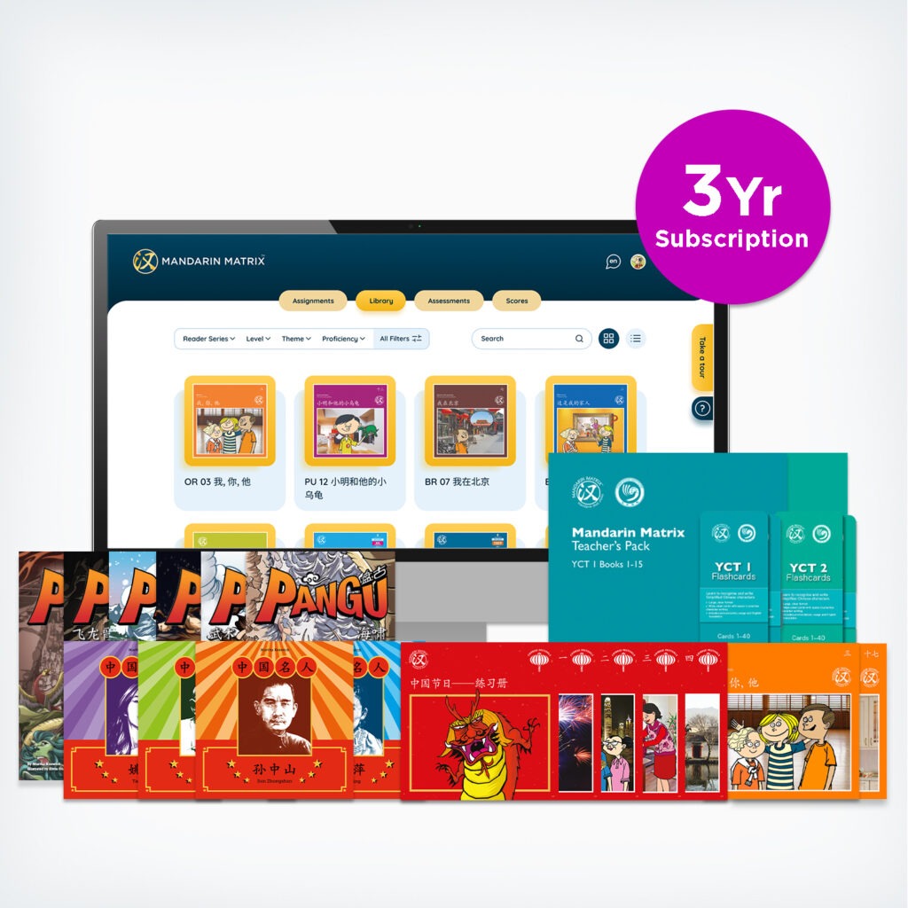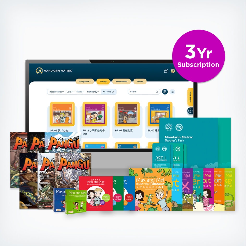 36 个月无限制访问 Matrix 在线课堂 (MMOC),再加上 YCT 教师包(1 级和 2 级),让您的孩子在班级中遥遥领先。 套装中的盘古漫画,《中国名人》和中国节日系列读物是学习中国文化和历史很好的材料。